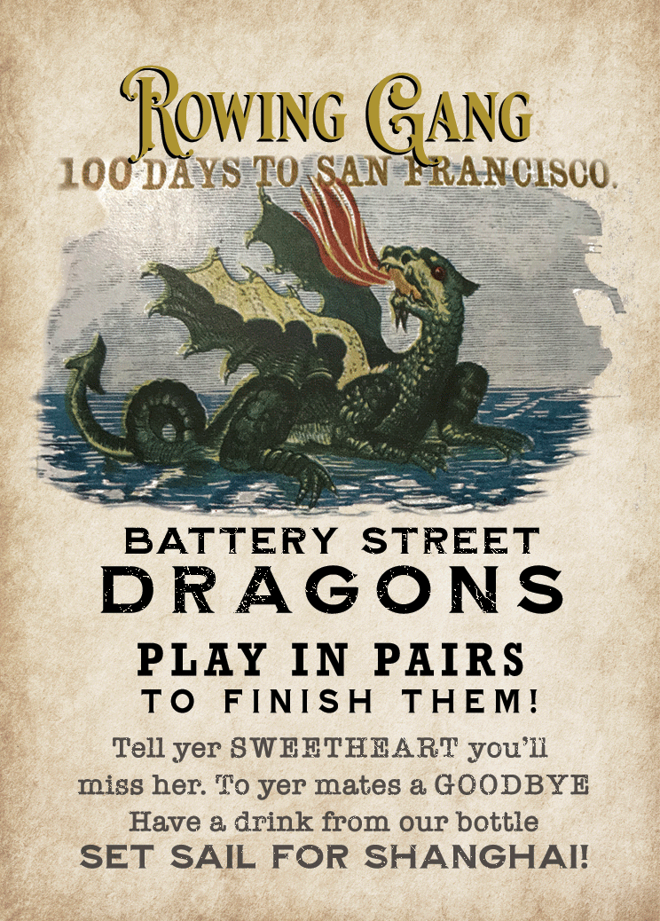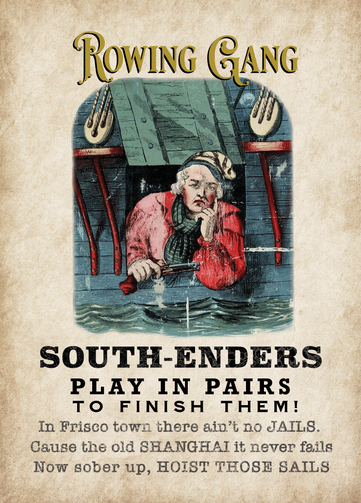 Shanghaiers need White Hall row boats to get their prizes out to the ship. A gang of bare-knuckled toughs are always standing by to row a pitiful sailor out to the deep water boats. Play these in matching pairs against a player that has drawn the Shanghai card to finish them off. Discard after play. If the Shanghai is a success, draw two cards from the Shanghaied players hand.